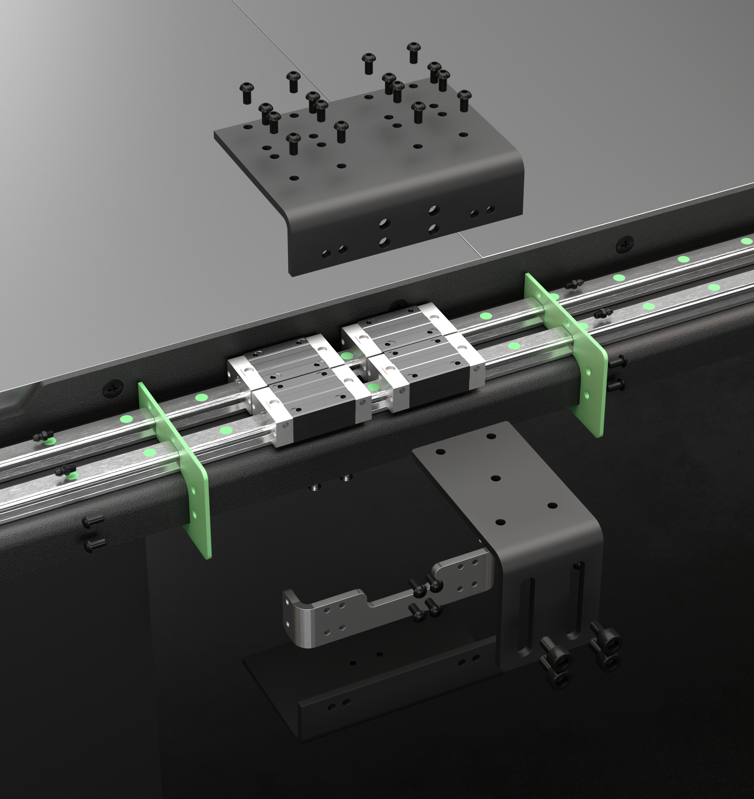 The five bolt pattern on the fence hat allows the four outside bolts to be loosened with the middle bolt used as a pivot point to quickly square the fence beam to the blade. Torquing all the bolts down creates an extremely secure connection between the fence beam and carriage that will last indefinitely.
