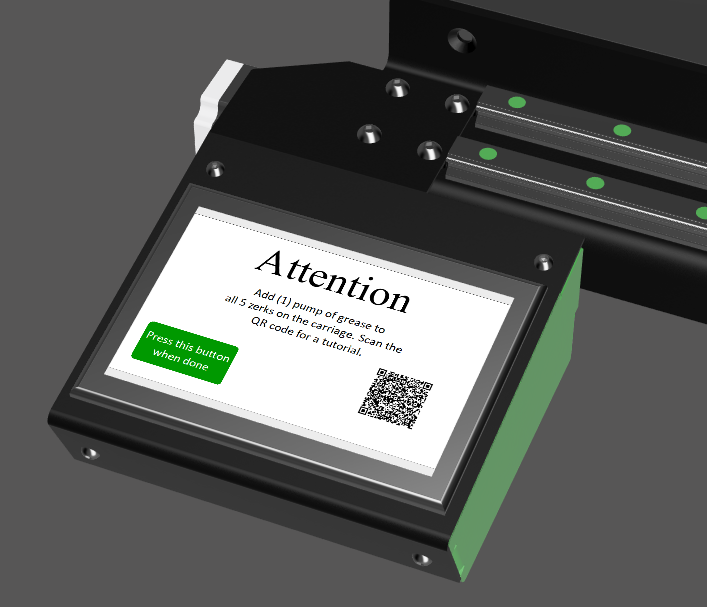 Factory set maintenance schedule will prompt the screen when it is time to grease the bearings and ball screw. With a QR code that links to a video that explains the procedure. You can also preset in process quality checks to ensure you are within tolerance, this can be set every month, week, day, or hour, it can also be set to a specific amount of movements of the fence. In a production environment this ensures your machine is within tolerance and always lubricated.
